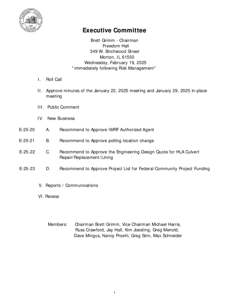 Executive Committee Brett Grimm Chairman Freedom Hall 349 W. Birchwood Street Morton, IL 61550 Wednesday, February 19, 2025 *immediately following Risk Management* I.Roll CallII. Approve minutes of