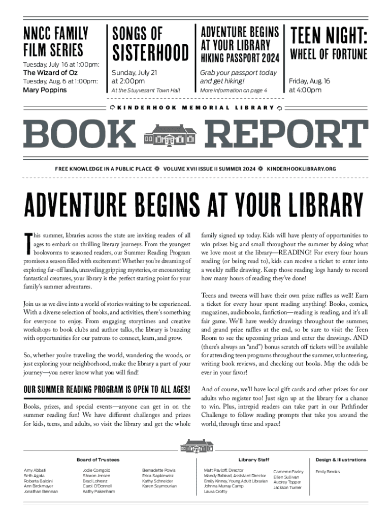 NNCC FAMILY FILM SERIES Tuesday, July 16 at 1:00pm:The Wizard of OzSONGS OFSISTERHOODADVENTURE BEGINS AT YOUR LIBRARYHIKING PASSPORT 2024Tuesday, Aug. 6 at 1:00pm:Sunday, July 21 at 2:00pmGrab your