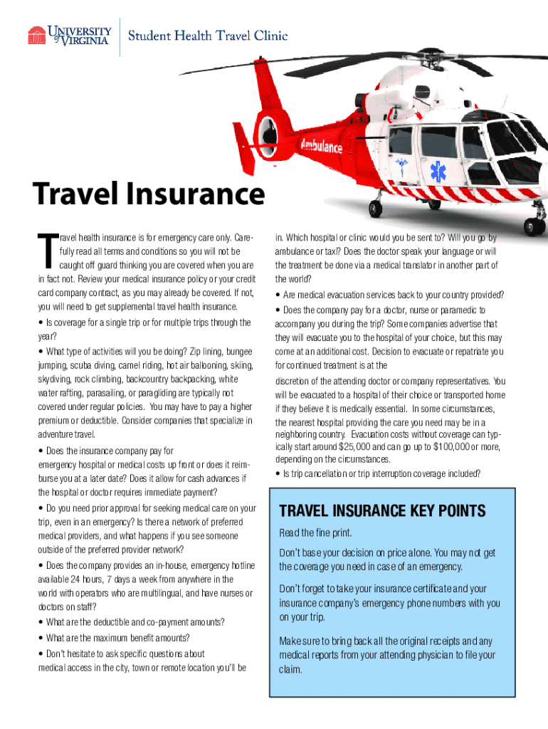 Travel InsuranceTravel health insurance is for emergency care only. Carefully read all terms and conditions so you will not be caught off guard thinking you are covered when you are in fact not. Review