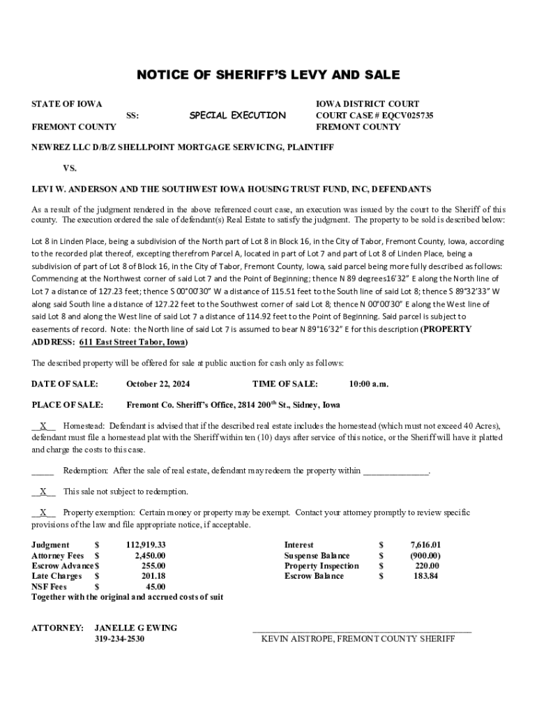 This document is a legal notice pertaining to the levy and sale of real estate ordered by the Iowa District Court in a special execution case. It outlines the details of the court case, the property