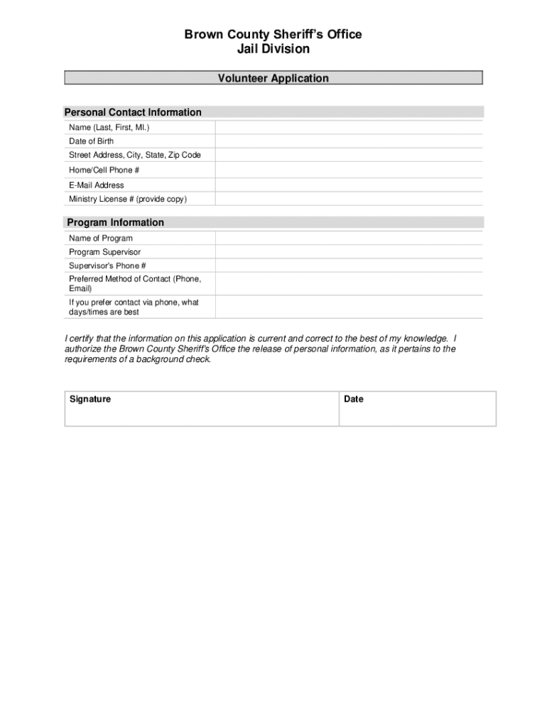 This document serves as a volunteer application for individuals wishing to participate in programs within the Brown County Jail. It includes personal contact information, program details, and certification