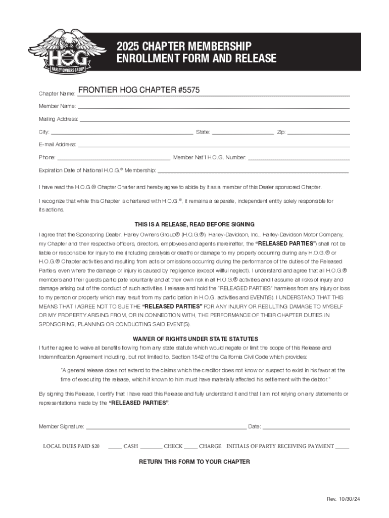 This document serves as a membership enrollment form for the Frontier HOG Chapter #5575, requiring personal information, emergency contact details, and agreement to the chapter\'s charter and release