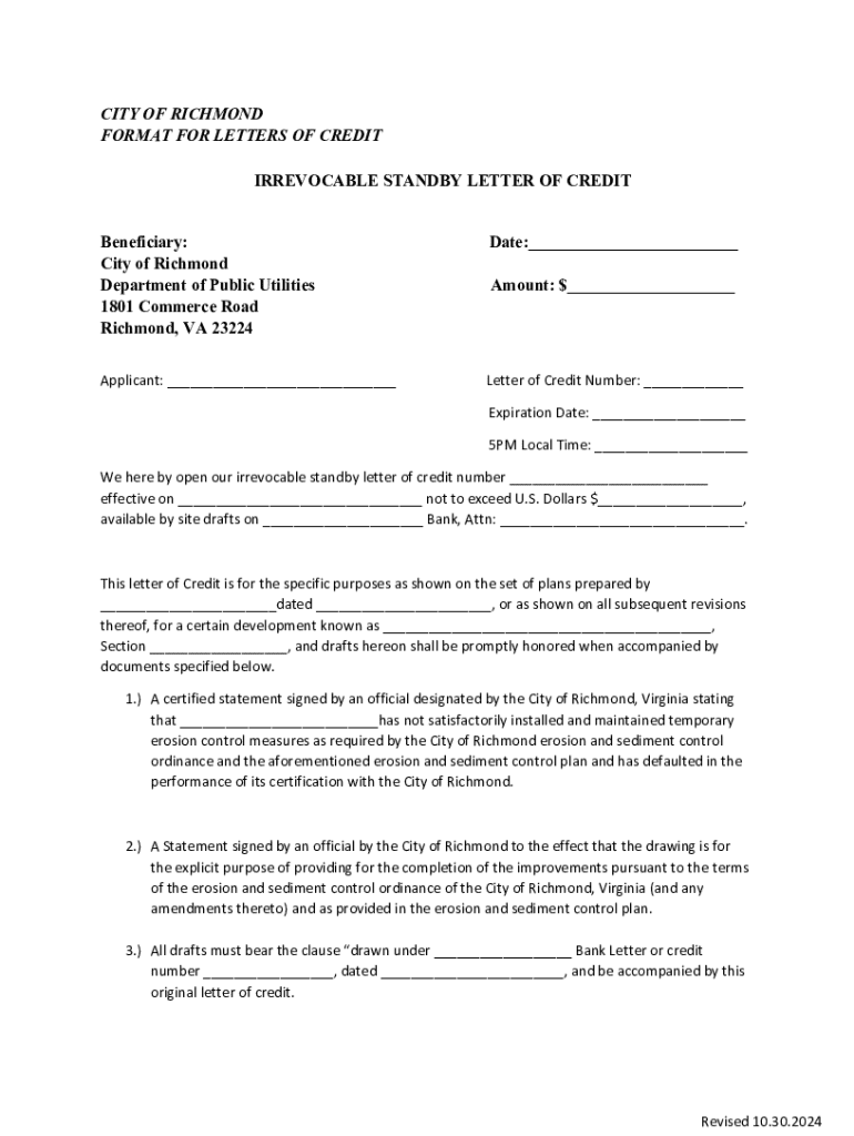 VA Irrevocable Standby Letter of Credit - City of Richmond 2024-2026 free printable template