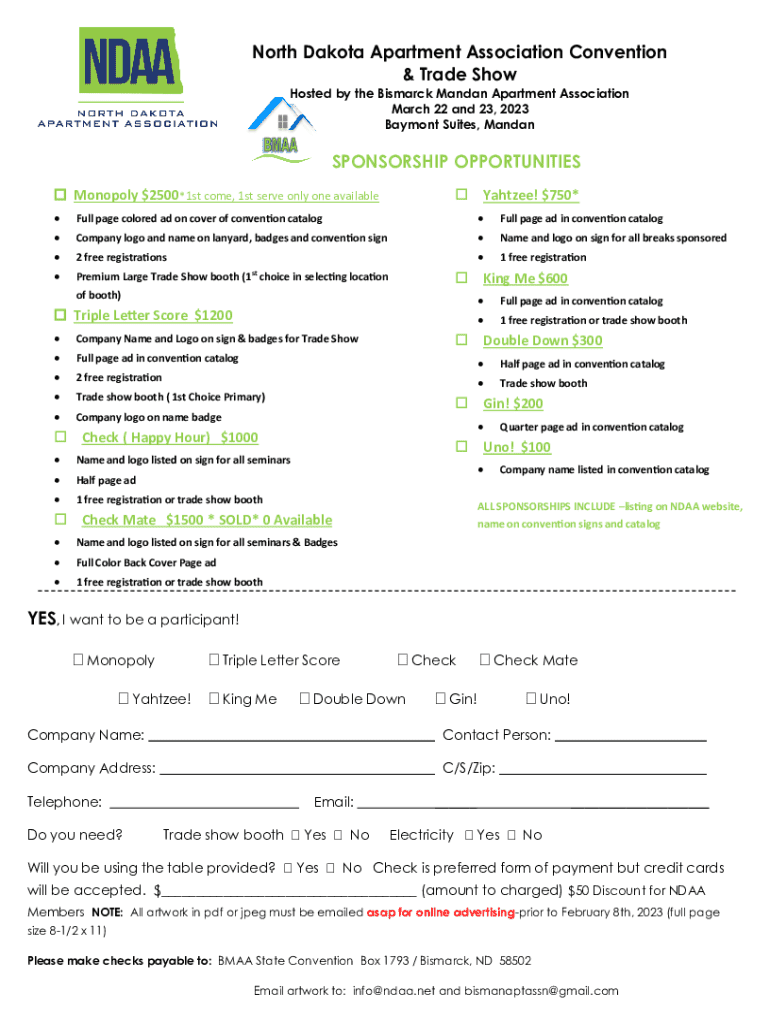 The document outlines the sponsorship opportunities and participation details for the North Dakota Apartment Association Convention & Trade Show hosted by the Bismarck Mandan Apartment Association