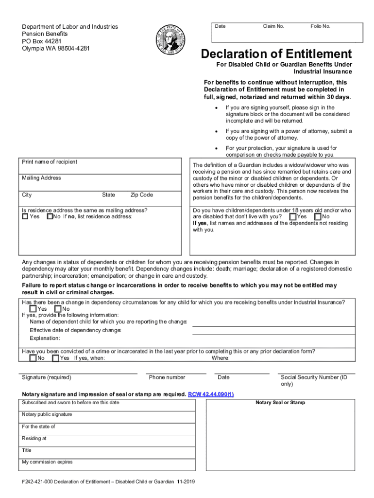 This form must be completed for Disabled Child or Guardian Benefits under Industrial Insurance. It requires notarization and submission within 30 days to ensure benefits continue without interruption.