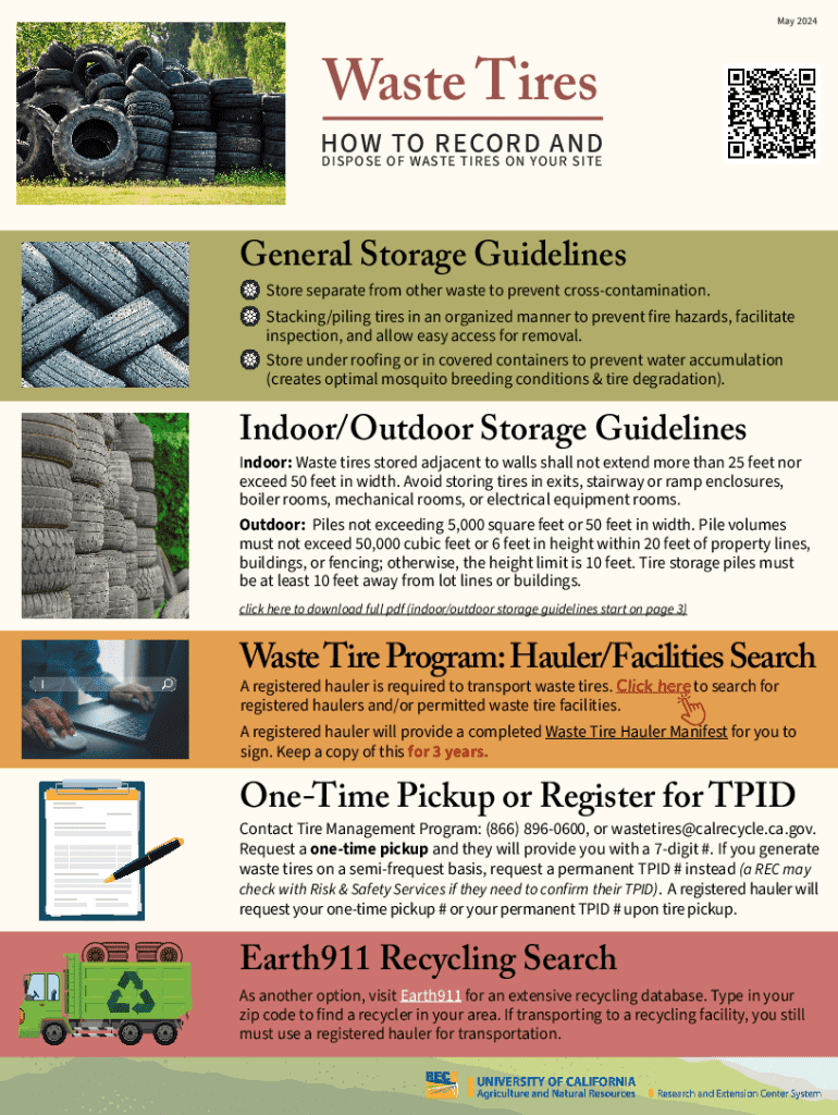 May 2024Waste TiresHOW TO RECORD AND DISPOSE OF WASTE TIRES ON YOUR SITEGeneral Storage GuidelinesStore separate from other waste to prevent crosscontamination. Stacking/piling tires in an organized