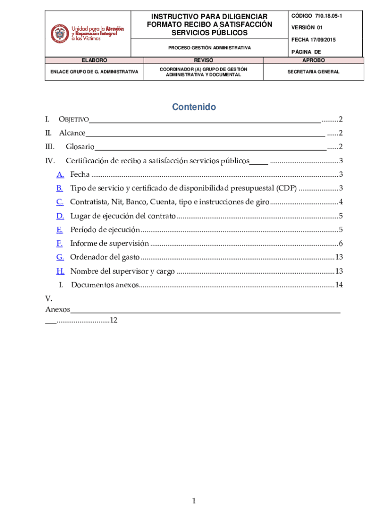 Este documento proporciona los lineamientos necesarios para el diligenciamiento de la certificación de recibo a satisfacción de servicios públicos, incluyendo detalles sobre los diferentes campos