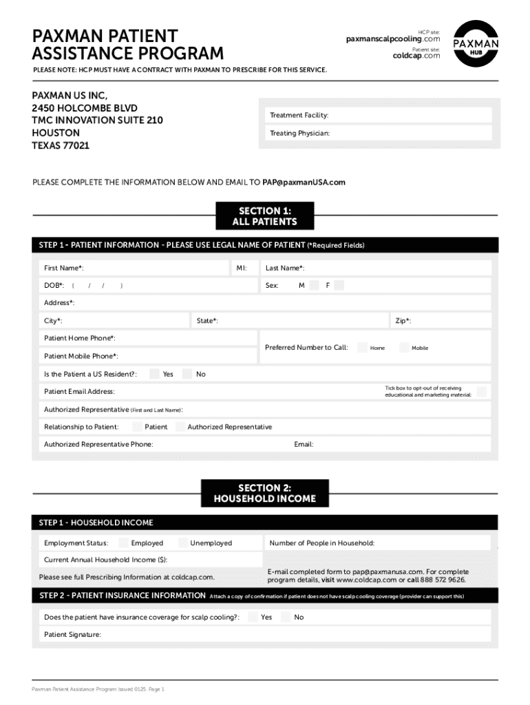 This form is intended for patients applying for assistance with scalp cooling treatment through the Paxman Patient Assistance Program. The program provides the Paxman Scalp Cooling Cap at no cost