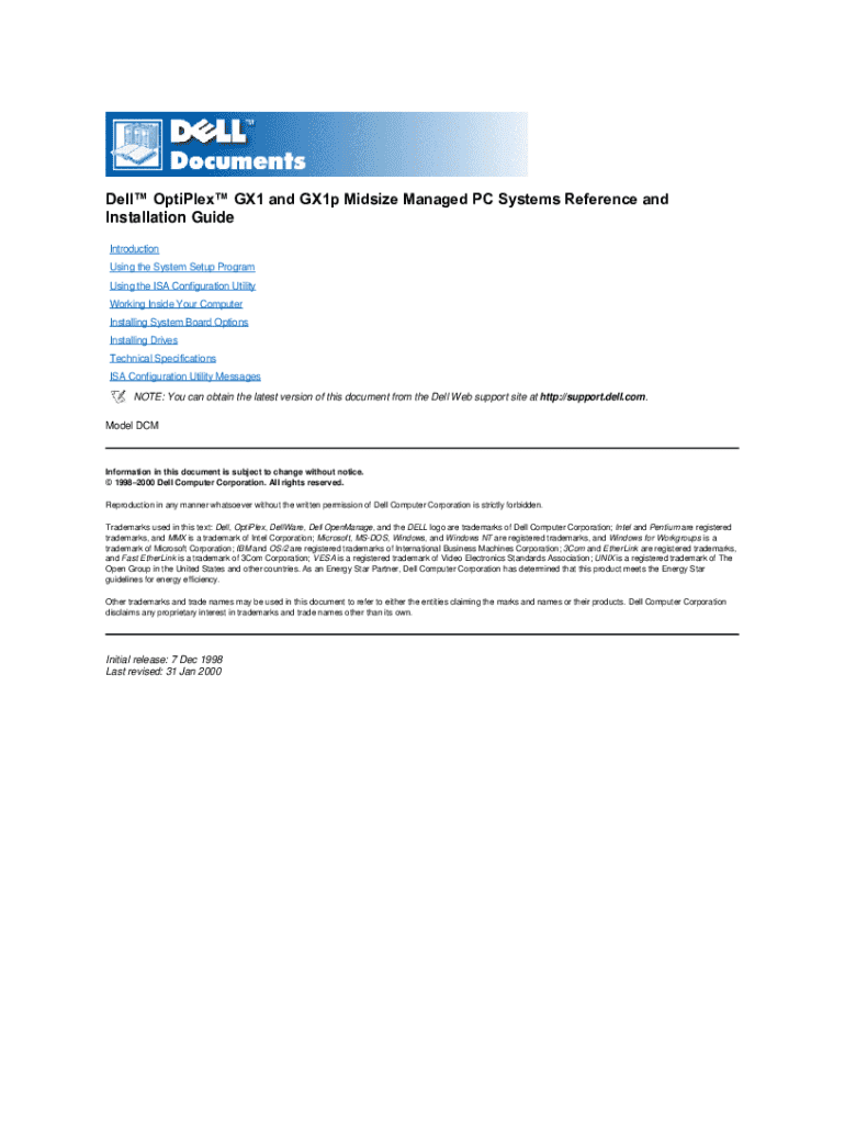 Dell OptiPlex GX1 and GX1p Midsize Managed PC Systems Reference and Installation Guide Introduction Using the System Setup Program Using the ISA Configuration Utility Working Inside Your Computer