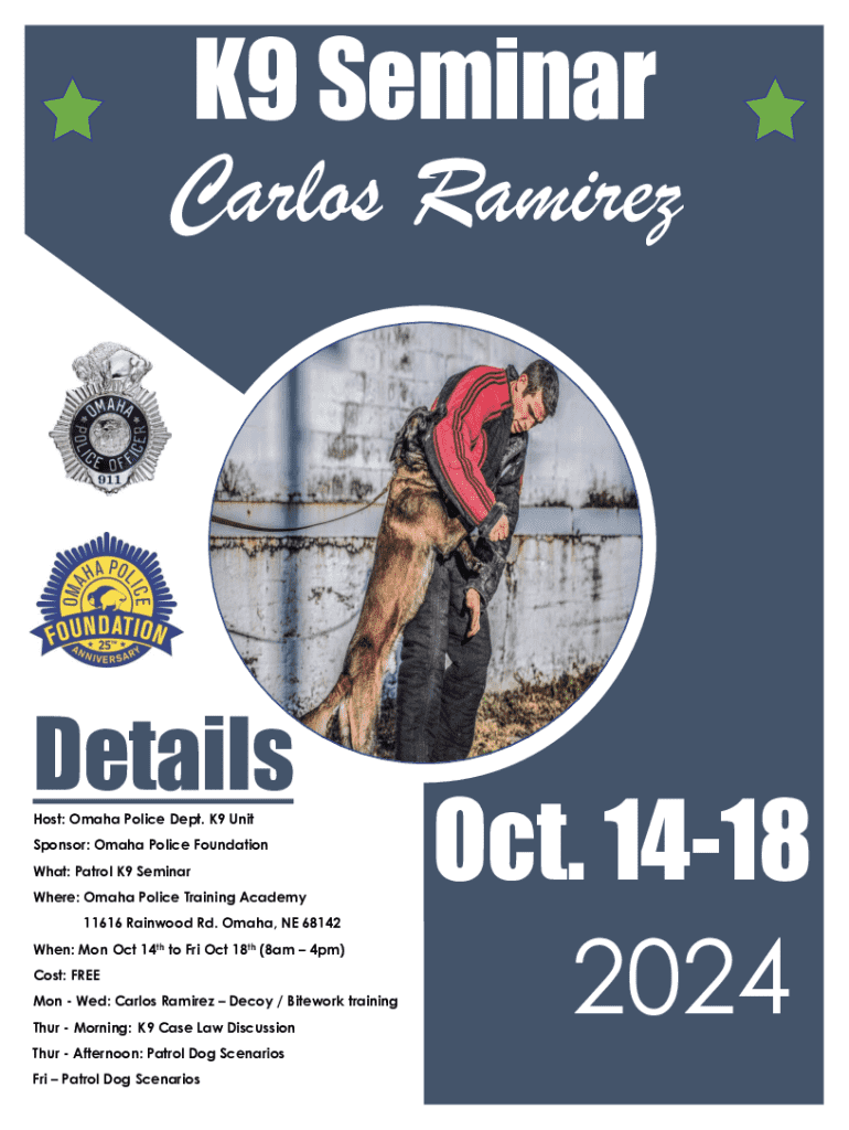 Este documento proporciona detalles sobre un seminario de K9 dirigido por el Departamento de Policía de Omaha, que incluye entrenamiento práctico y sesiones teóricas sobre el manejo de perros de