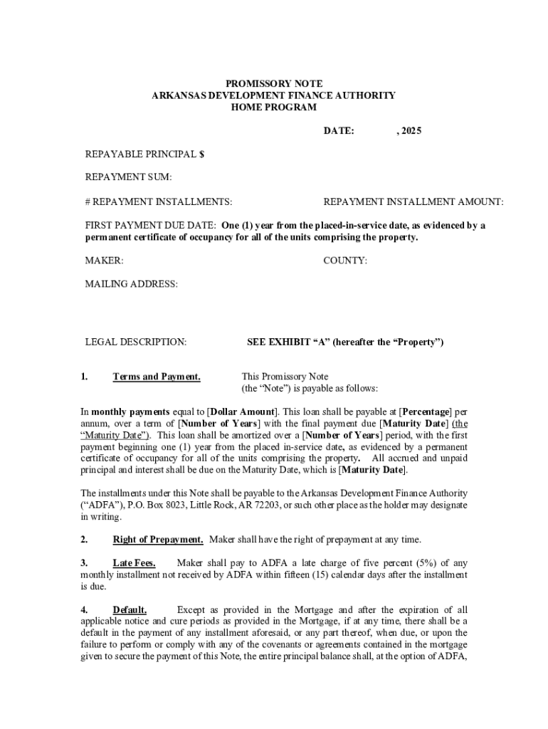 This document outlines a legally binding promissory note between the Maker and the Arkansas Development Finance Authority that specifies repayment terms for a loan, including principal, interest,