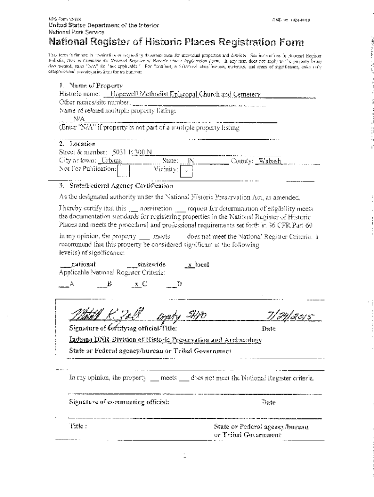 Este formulario documenta la inscripción del Hopewell Methodist Episcopal Church y el cementerio en el Registro Nacional de Lugares Históricos. Describe la propiedad, su historia arquitectónica,