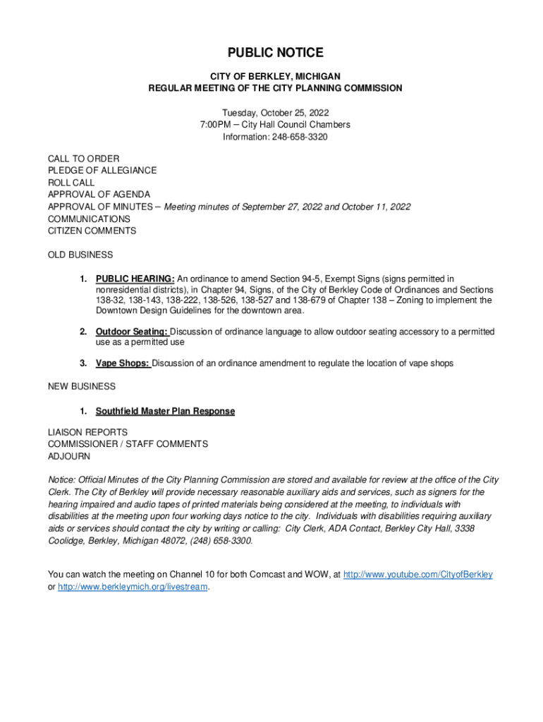 This document serves as a public notice for the regular meeting of the City Planning Commission of Berkley, Michigan, scheduled for October 25, 2022. It outlines the agenda which includes approval