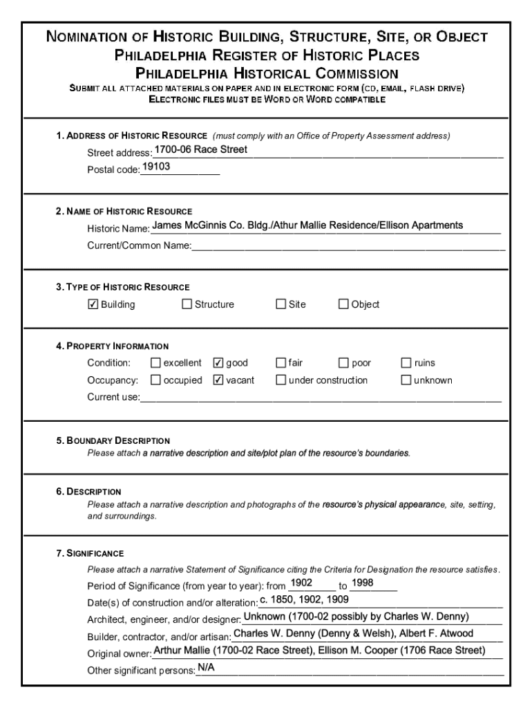Get the free Nomination to the Philadelphia Register of Historic Places