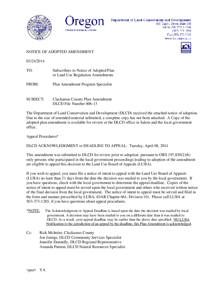 The document details the acknowledgment and procedures regarding the adopted plan amendment for Clackamas County, including deadlines for appeals, the acknowledgment of land use regulation amendments,