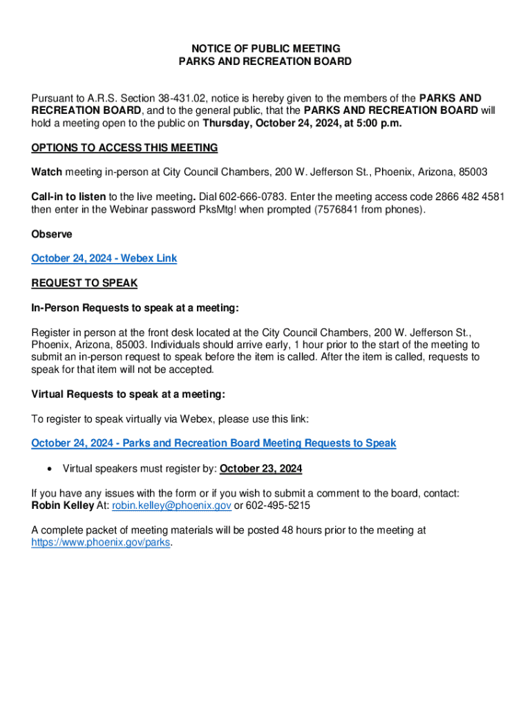 This document provides notice for the public meeting of the Parks and Recreation Board, outlining options for attendance, procedures for public comment, and an agenda for discussions related to the