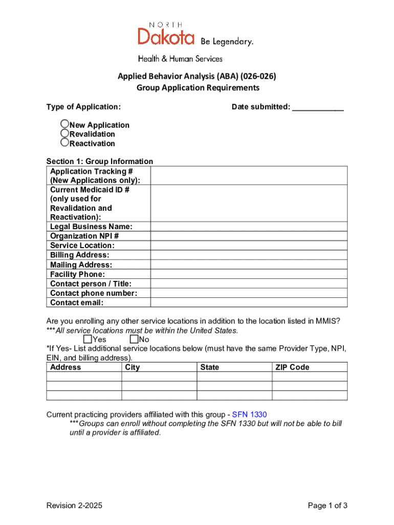This document outlines the application requirements for groups seeking to enroll in the Medicaid program for Applied Behavior Analysis services, including necessary information and documentation for