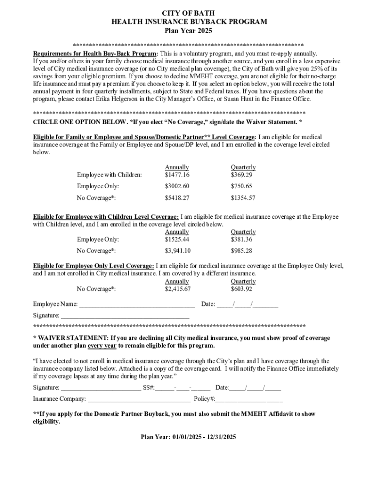 This document outlines the requirements and options for the Health Buy-Back Program offered by the City of Bath for the year 2025. It details the eligibility criteria, payment structures, and necessary
