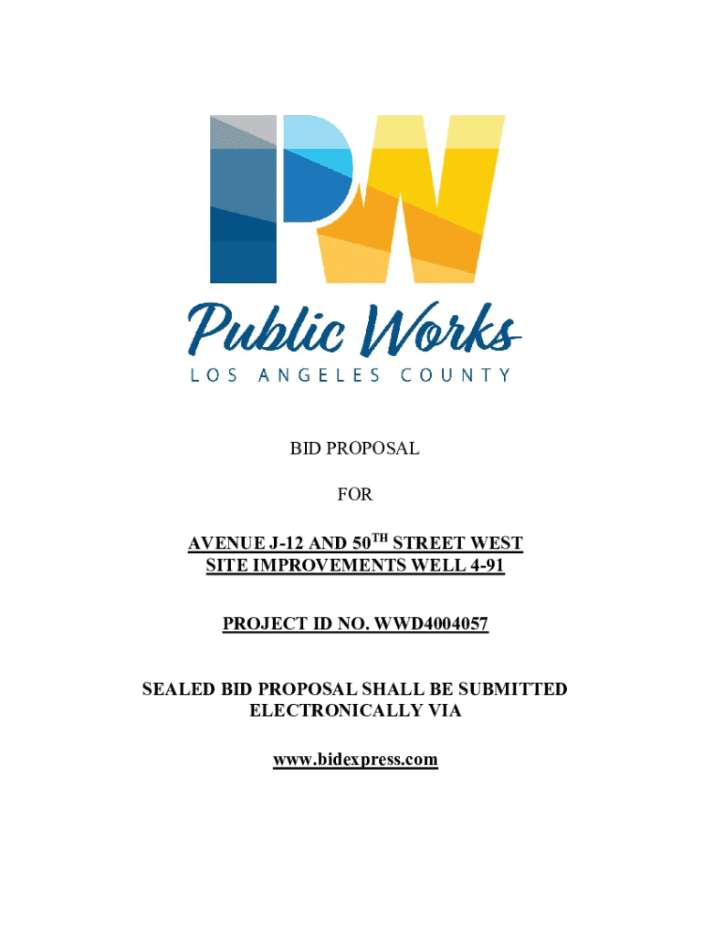 This document is a bid proposal for site improvements at Avenue J-12 and 50th Street West, identified as Project ID No. WWD4004057. It outlines the requirements for submission, including forms for