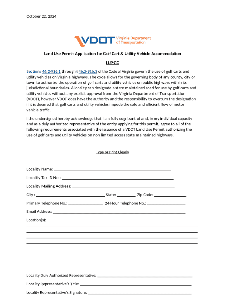 Template Land Use Permit Application for Golf Cart & Utility Vehicle Accommodation instructions