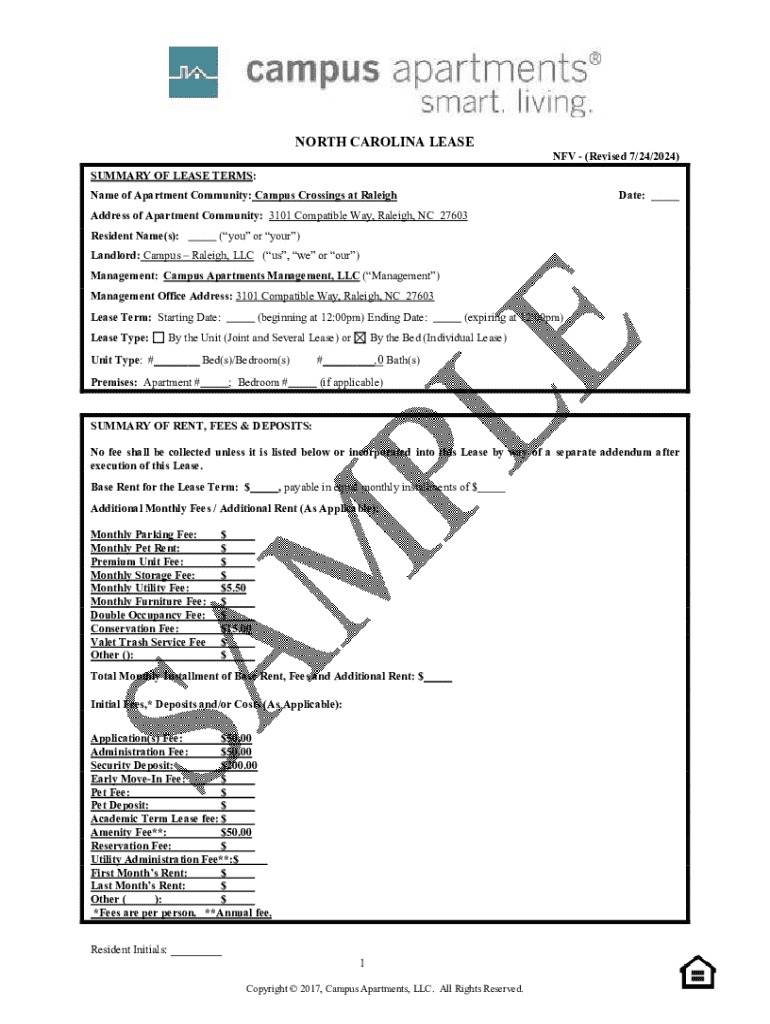 This document is a lease agreement for the Campus Crossings at Raleigh, detailing terms of rent, fees, security deposits, lease duration, and resident and landlord responsibilities. It also includes