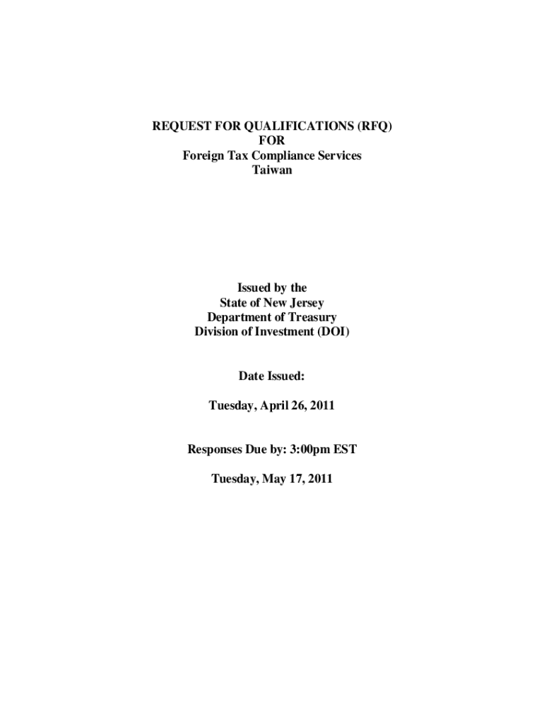 This RFQ solicits proposals from advisors for tax compliance services in Taiwan for the State of New Jersey\'s Division of Investment, detailing regulations, requirements, and evaluation processes