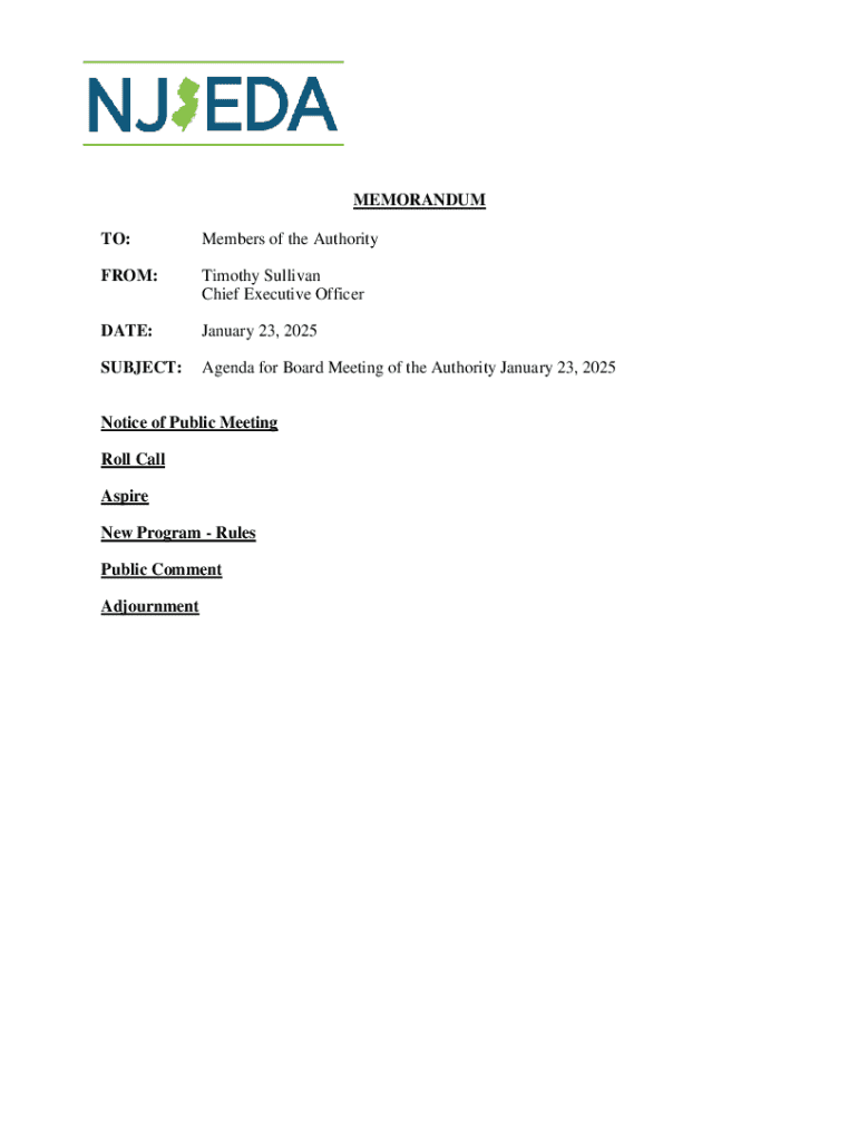 MEMORANDUM TO:Members of the AuthorityFROM:Timothy Sullivan Chief Executive OfficerDATE:January 23, 2025SUBJECT:Agenda for Board Meeting of the Authority January 23, 2025Notice of Public Meeting Roll