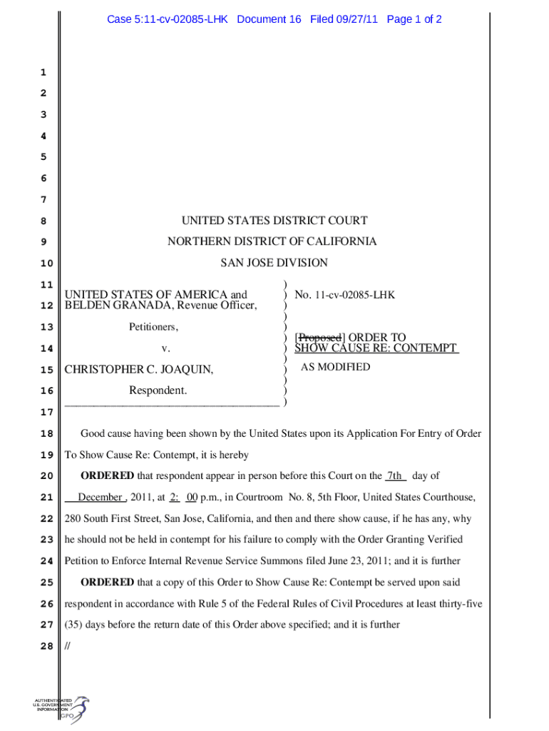 Get the free Case 5:11-cv-02085-LHK Document 16 Filed 09/27/11 Page 1 of 2