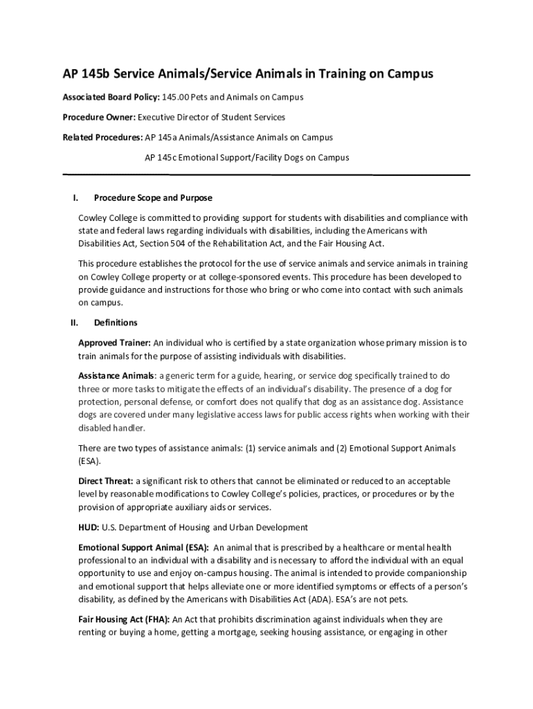 AP 145B Service Animals Service refers to a specific regulation or guideline that outlines the rights and responsibilities regarding service animals and their use in various environments, ensuring compliance with related laws and standards.