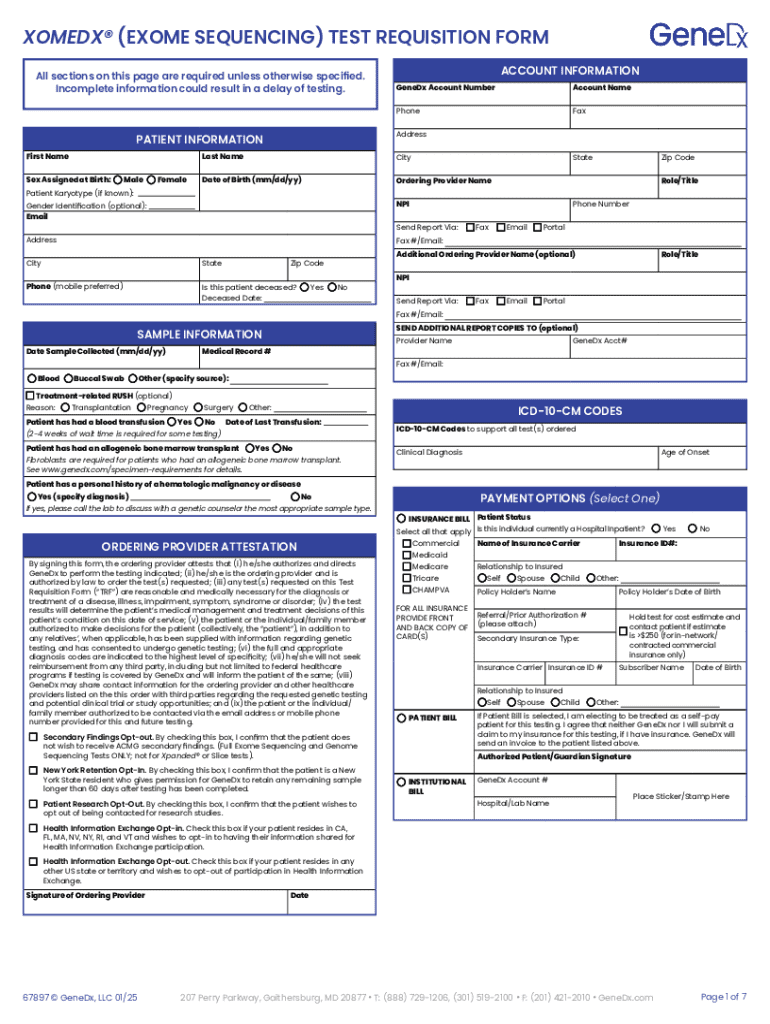 To fill out the xomedx exome sequencing test, a physician typically completes a requisition form that includes patient information, medical history, and the reason for testing.