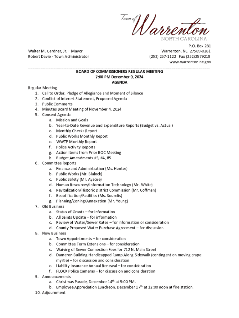 Walter M. Gardner, Jr. Mayor Robert Davie Town AdministratorP.O. Box 281 Warrenton, NC 275890281 (252) 2571122 Fax (252)2579219 www.warrenton.nc.gov___BOARD OF COMMISSIONERS REGULAR MEETING 7:00 PM