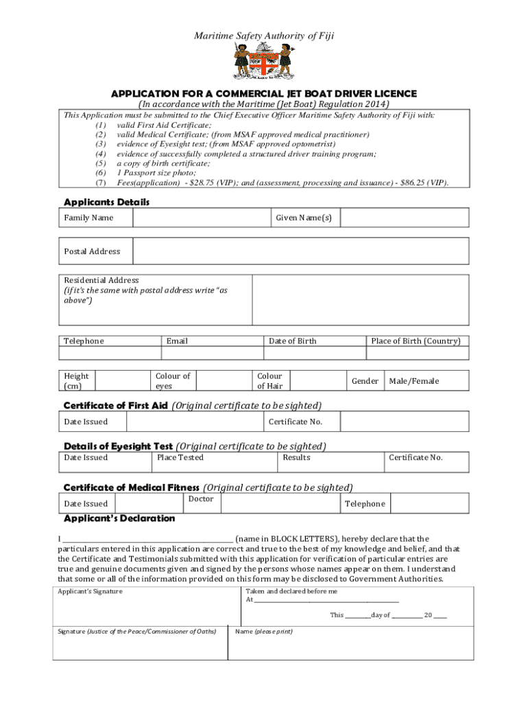 This application form is for individuals seeking to obtain a commercial jet boat driver licence as per the Maritime (Jet Boat) Regulation 2014. It requires the submission of various documents, including