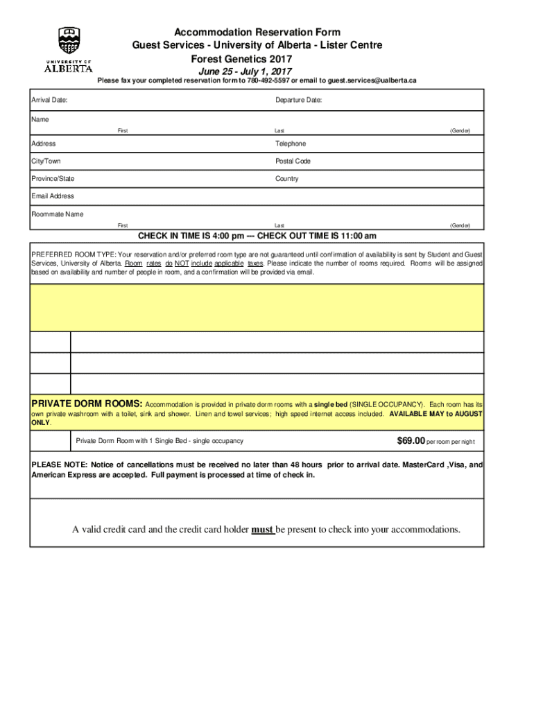 This form is used to reserve accommodations at the Lister Centre, University of Alberta, for the Forest Genetics 2017 conference. It includes details needed for the reservation, such as guest information,