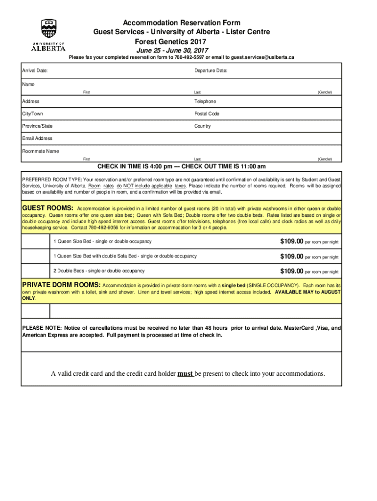 Este formulario es para la reserva de alojamiento en el Lister Centre de la Universidad de Alberta durante el evento Forest Genetics 2017, que se llevará a cabo del 25 al 30 de junio de 2017. Incluye