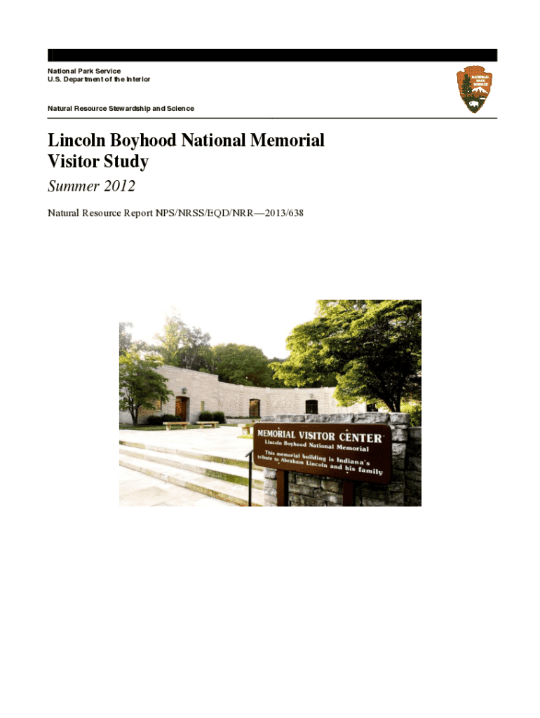 This report presents the findings of the visitor study conducted at Lincoln Boyhood National Memorial from June 19-25, 2012. The survey aimed to gather insights on visitor demographics, experiences,
