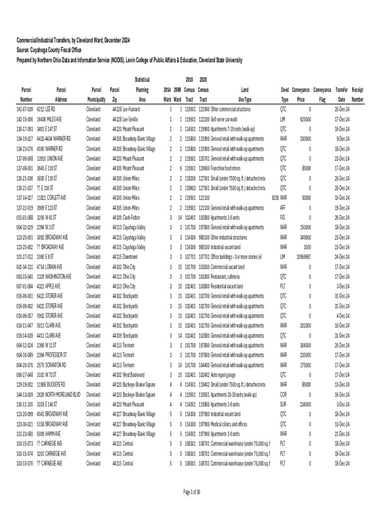 This document provides detailed information on the commercial and industrial property transfers within Cleveland for the month of December 2024, including parcel numbers, addresses, municipalities,