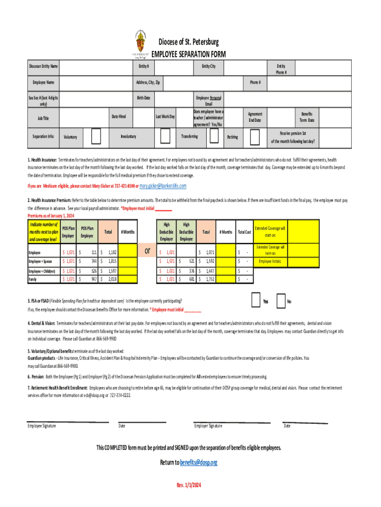 This form is used for documenting the separation of employees from the Diocese of St. Petersburg, outlining critical information regarding their last workday, benefits termination, and options regarding
