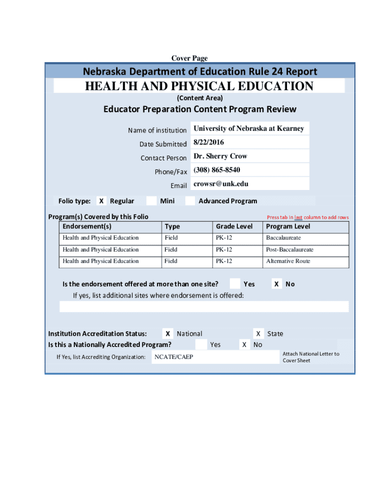 This document contains a program review for the Health and Physical Education endorsement at the University of Nebraska at Kearney. It includes context, assessment data, and ongoing improvements in