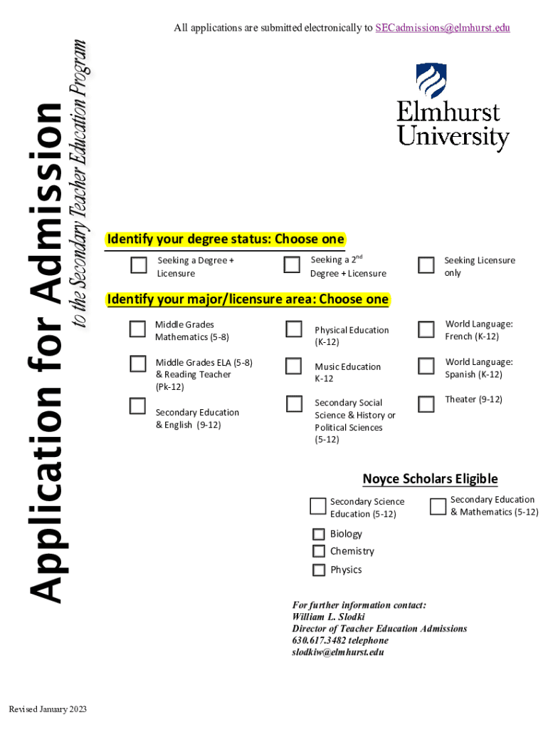 All applications are submitted electronically to SECadmissions@elmhurst.eduIdentify your degree status: Choose one Seeking a Degree + LicensureSeeking a 2nd Degree + LicensureSeeking Licensure onlyIdentify