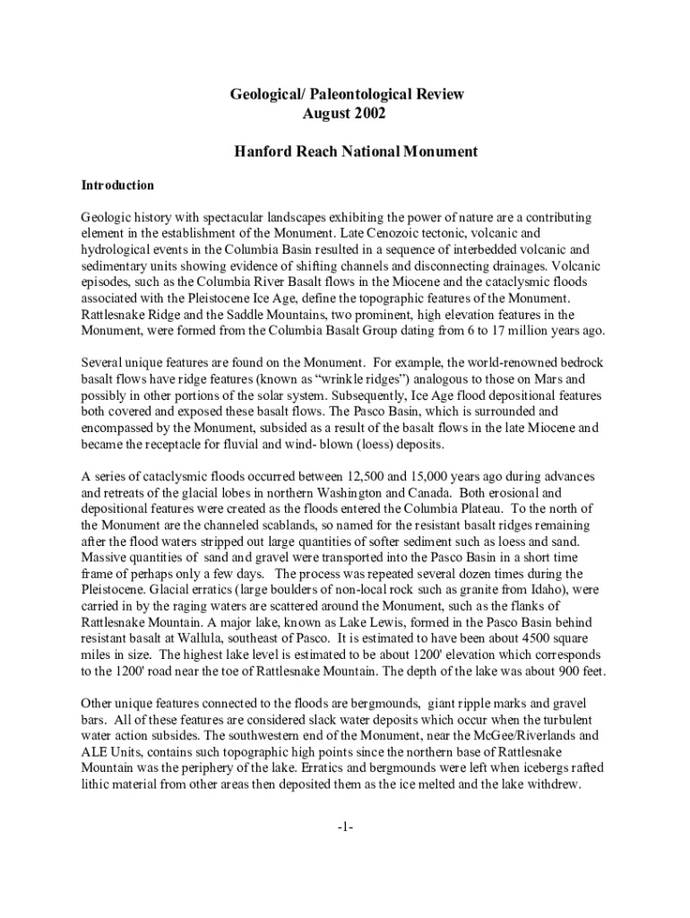 Geological/ Paleontological Review August 2002 Hanford Reach National Monument Introduction Geologic history with spectacular landscapes exhibiting the power of nature are a contributing element in