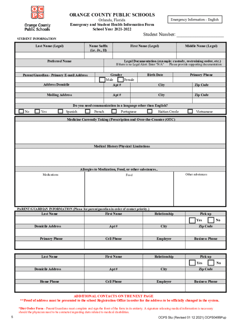 Este formulario se utiliza para recopilar información de emergencia y salud del estudiante para el año escolar 2021-2022 en las Escuelas Públicas del Condado de Orange.