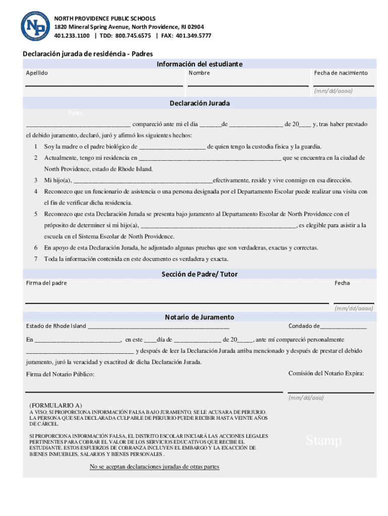 Este formulario es utilizado por los padres para declarar la residencia y la custodia de un estudiante que asiste al Sistema Escolar de North Providence. La declaración es presentada bajo juramento