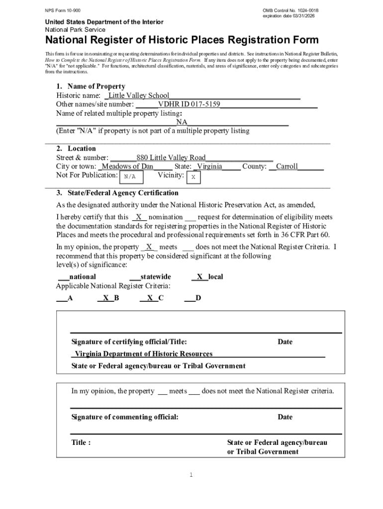 This form is used for nominating or requesting determinations for individual properties and districts to be listed in the National Register of Historic Places. It includes sections for property name,