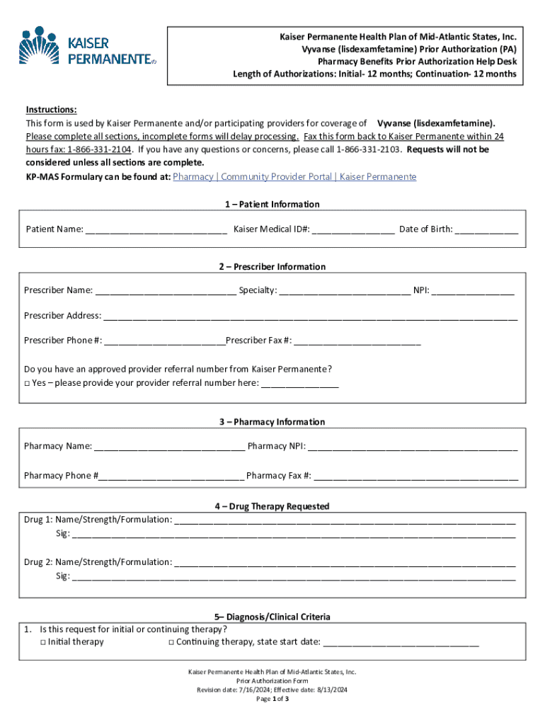 This form is used by Kaiser Permanente and/or participating providers to request coverage for (). It requires the completion of all sections to avoid delays in processing and must be faxed back to