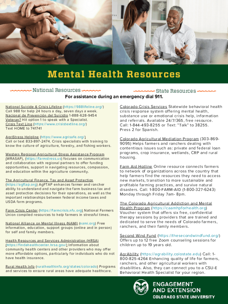 Mental Health Resources National Resources State Resources For assistance during an emergency dial 911. National Suicide & Crisis Lifeline (https://988lifeline.org/) Call 988 for help 24 hours a day,