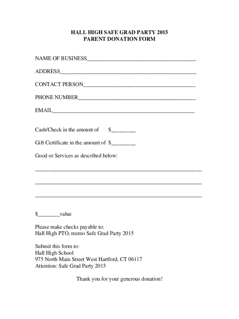 This form is for parents to donate cash, checks, or goods and services for the Hall High Safe Grad Party 2015.