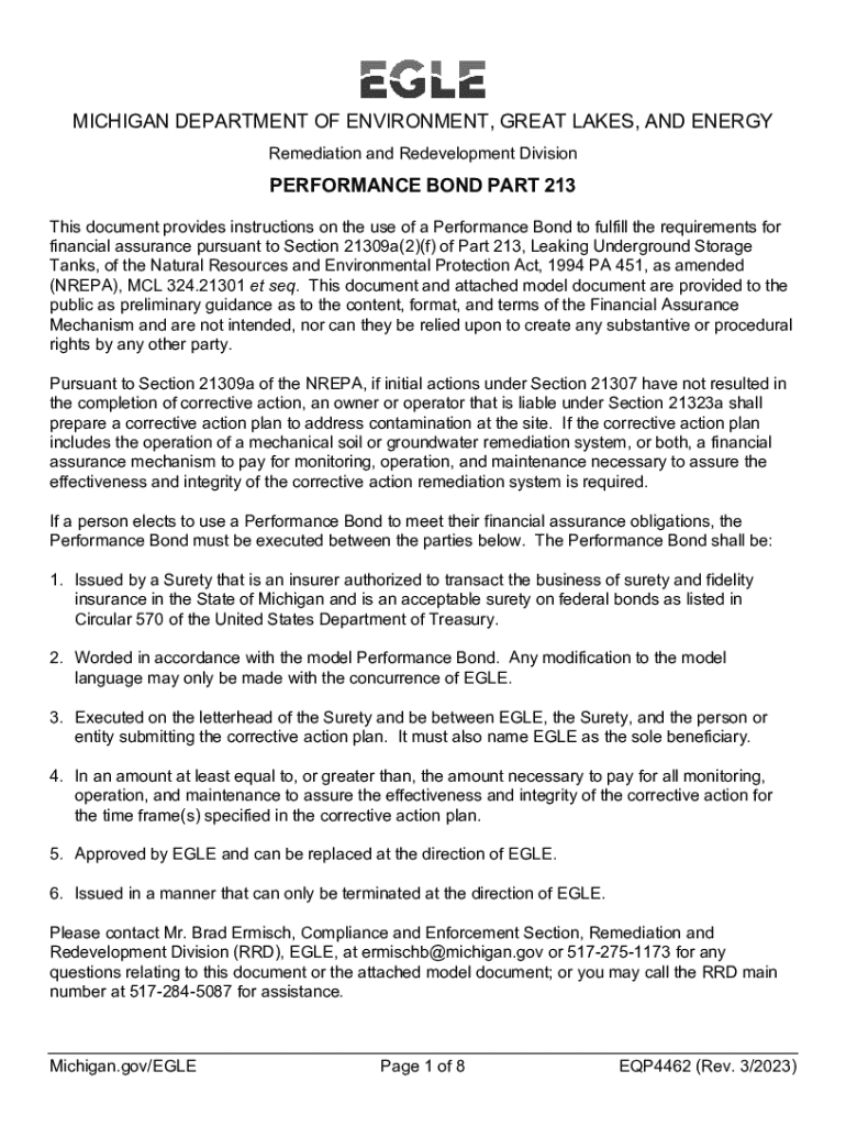 This document provides guidelines for the use of a Performance Bond to meet financial assurance requirements under Part 213 of the NREPA for leaking underground storage tanks. It outlines the obligations
