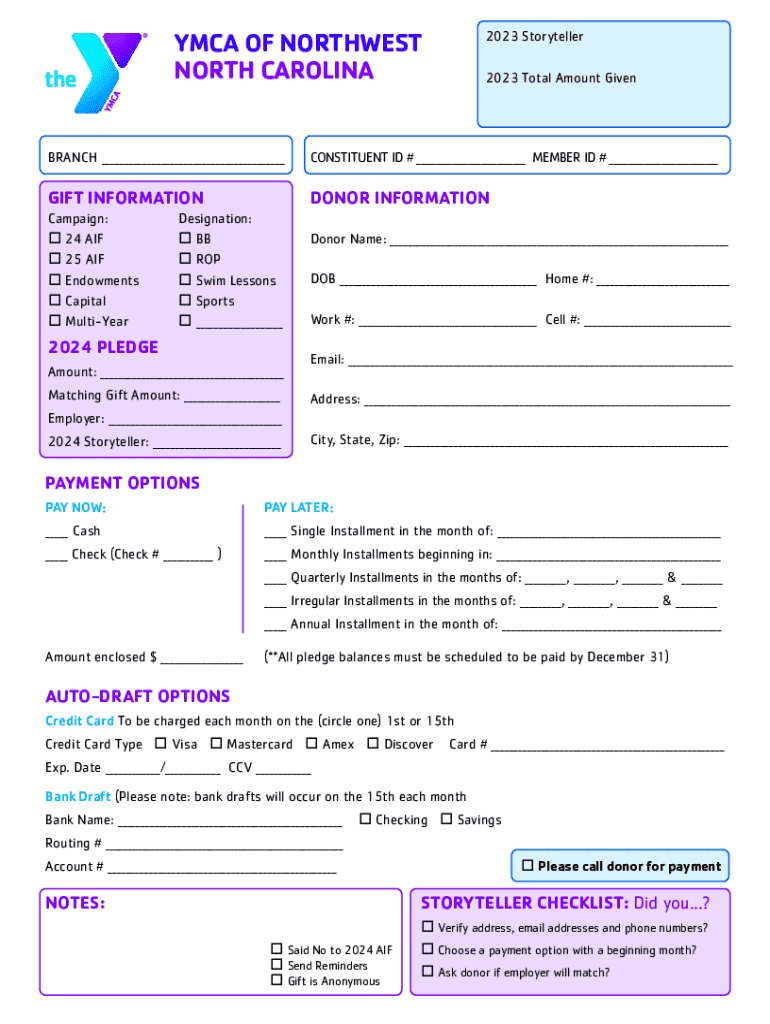 YMCA OF NORTHWEST NORTH CAROLINA2023 Storyteller 2023 Total Amount GivenBRANCH ___CONSTITUENT ID # ___ MEMBER ID # ___GIFT INFORMATIONDONOR INFORMATIONCampaign: o 24 AIF o 25 AIF o Endowments o Capital