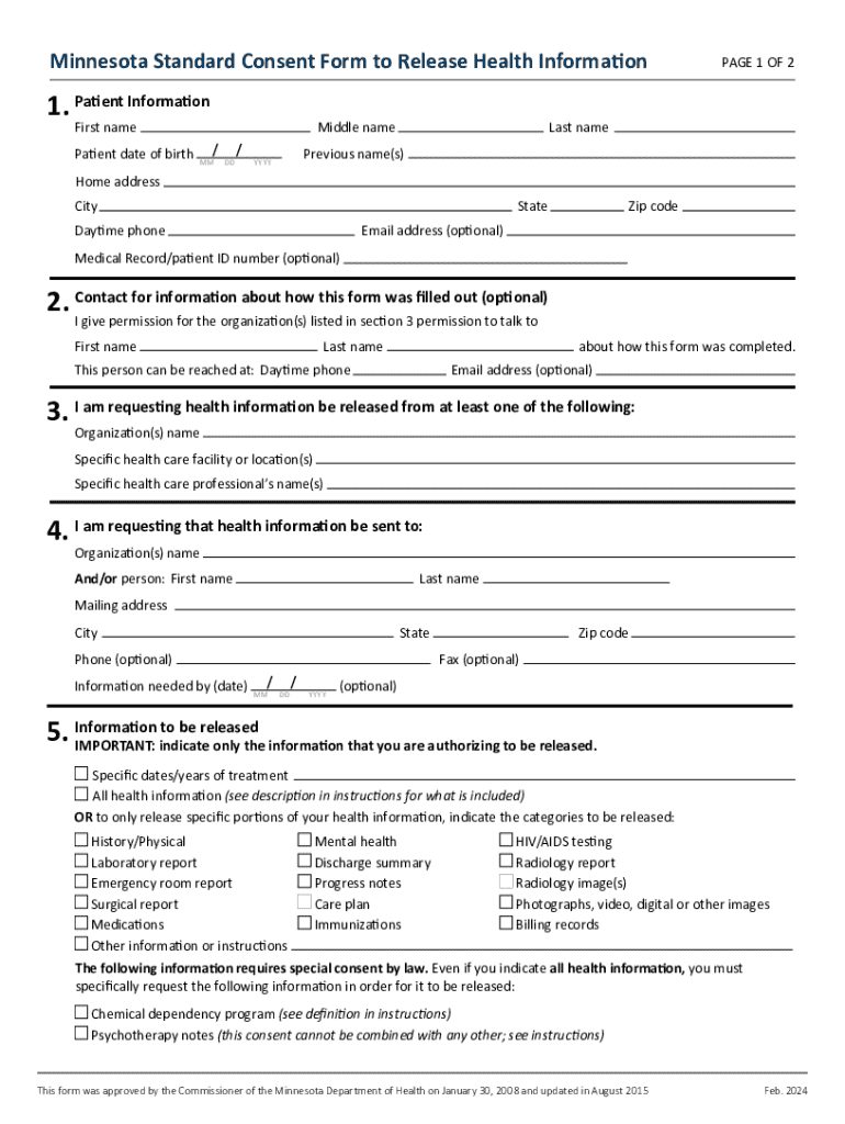 MN DoH Standard Consent Form to Release Health Information 2024-2026 free printable template