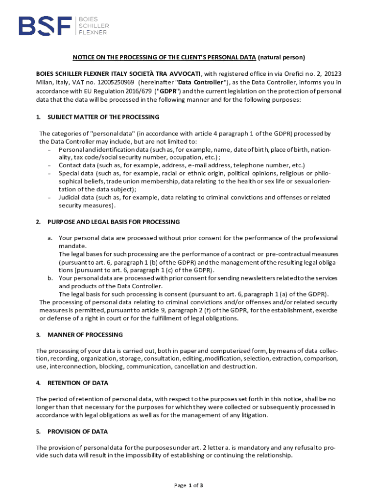This document informs clients about the processing of their personal data as required by GDPR. It outlines the types of personal data processed, purposes for processing, legal bases, data retention